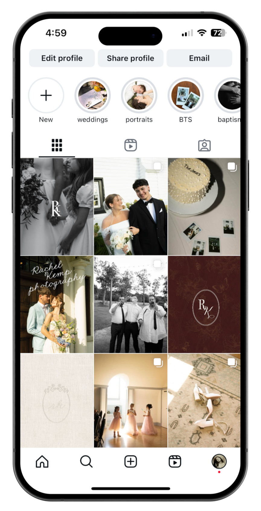 This branding was created for my photography business, Rachel Kemp Photography. My work follows a documentary style, focusing on capturing the beauty of everyday moments. The brand identity reflects this approach through modern, playful design elements, including refreshed logos and adaptable brand marks for social media and website use.