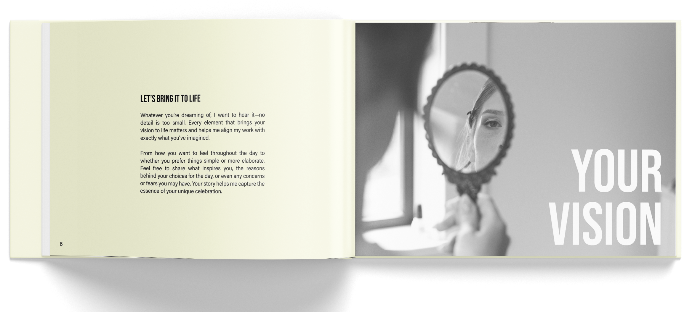 The wedding experience guide introduces potential clients to the process of working together, clearly outlining each step from booking to gallery delivery.