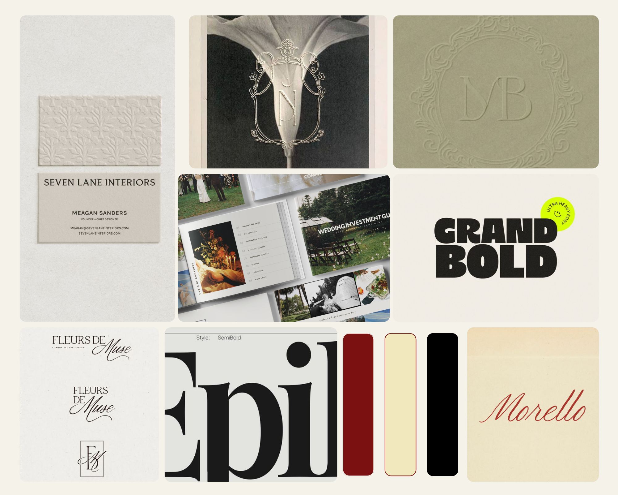 Additional collateral, including a business card and wedding experience guide, extends the identity across key stages of the client experience, creating a cohesive and consistent brand presence.