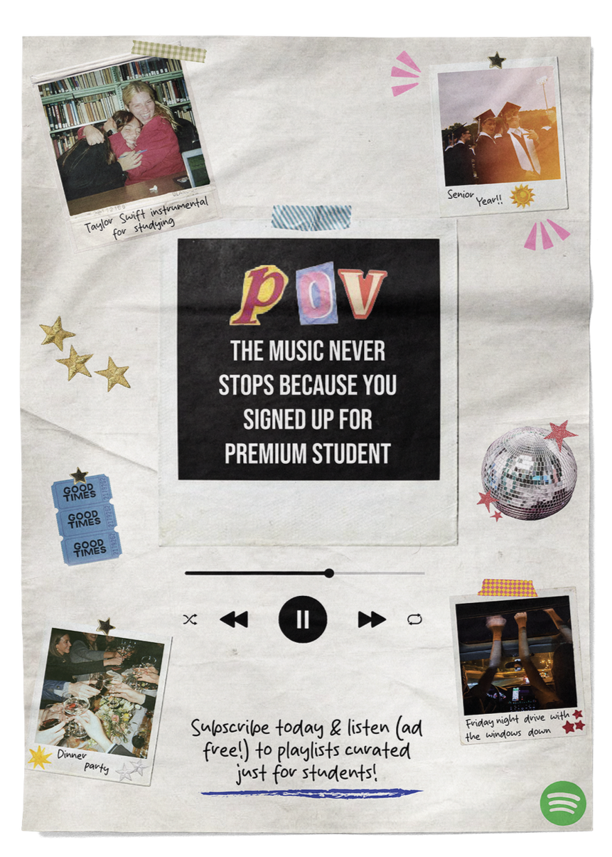 This campaign encourages college students to upgrade to a student premium account by highlighting how ads on the free version of Spotify disrupt the mood of everyday moments. Whether walking to class, studying late at night, or driving with friends, music sets the tone—and interruptions break the experience.
