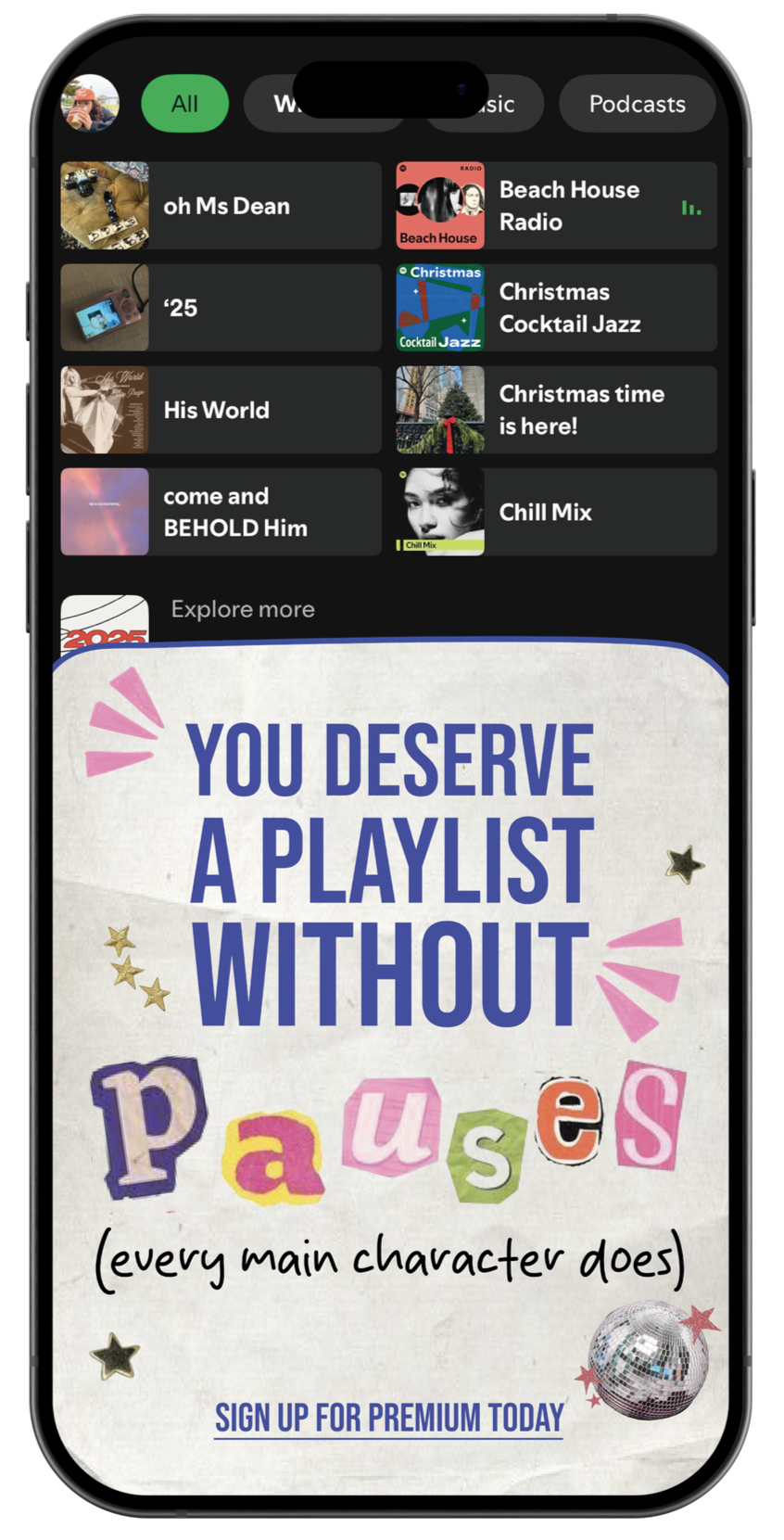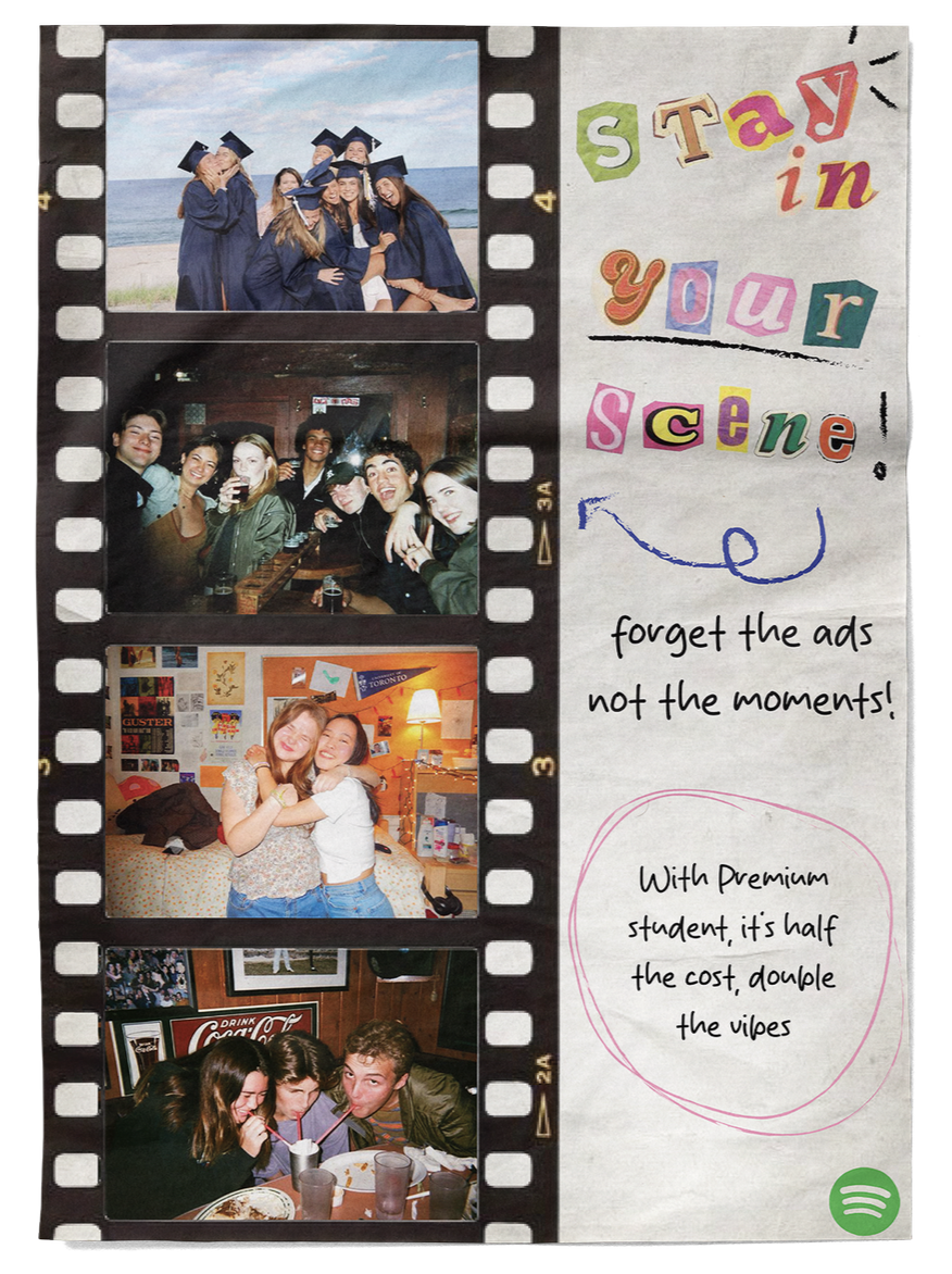 Rooted in the “main character” aesthetic, the campaign uses scrapbook-inspired visuals to romanticize the mundane and position premium as the key to controlling your soundtrack—and your story. The concept extends across out-of-home ads, campus posters, a branded Spotify pop-up, curated Instagram content, and guerrilla photobooth, creating a cohesive presence both on campus and online.