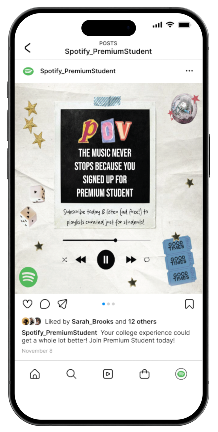 This mobile photo booth travels across campuses, creating an interactive and memorable experience for students. By capturing moments set to a curated soundtrack, it allows participants to actively engage with the campaign’s “main character” concept. This immersive experience highlights what makes the student premium offering feel personal, elevating everyday moments into something worth remembering.